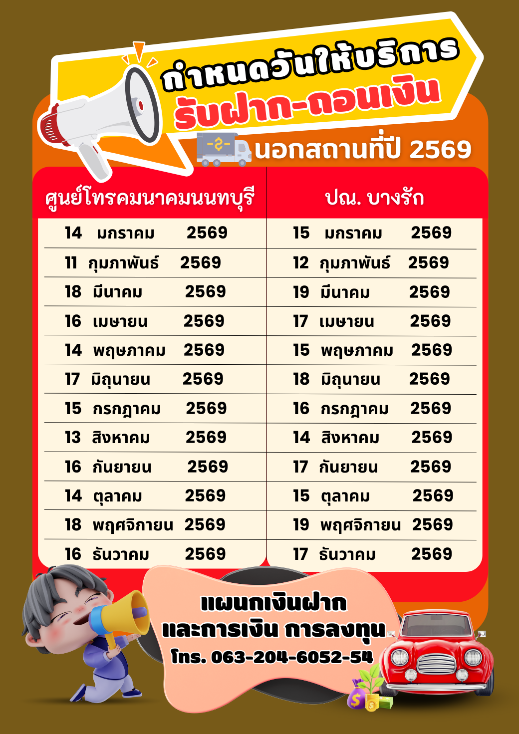 ตารางกำหนดวันให้บริการรับฝาก-ถอนเงินนอกสถานที่ ประจำปี 2569